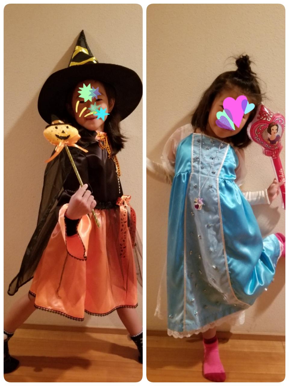 英会話教室でのハローインパーティーで着る衣装を孫に頼まれ作りました。エルサの衣装はアナ雪が流行った頃、長女に作った物を少し手直しし、妹が着ました。