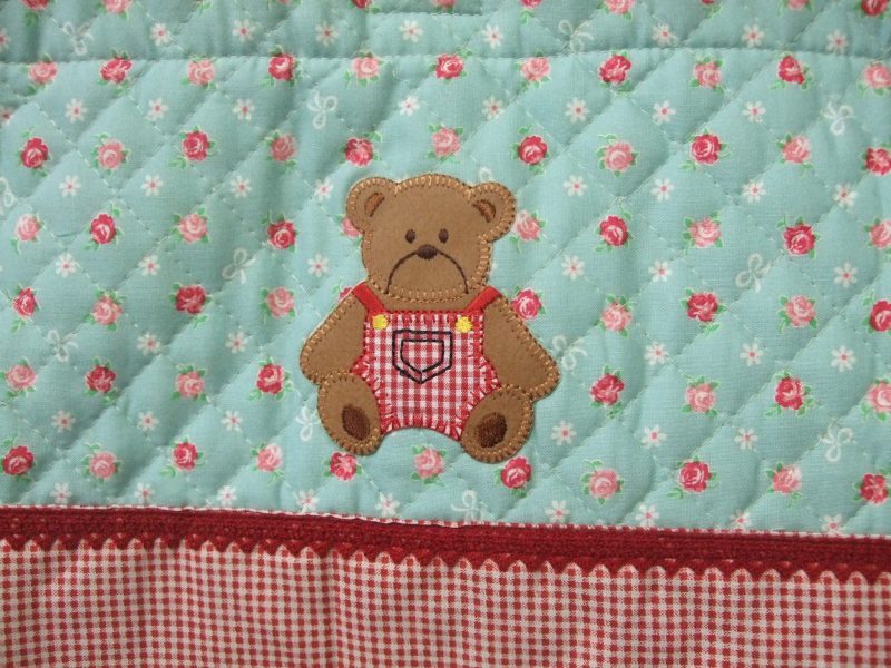 小花キルトにチェックの生地を重ね切り替えの部分に赤色のトーションレースを縫い付けアクセントにしてみました。