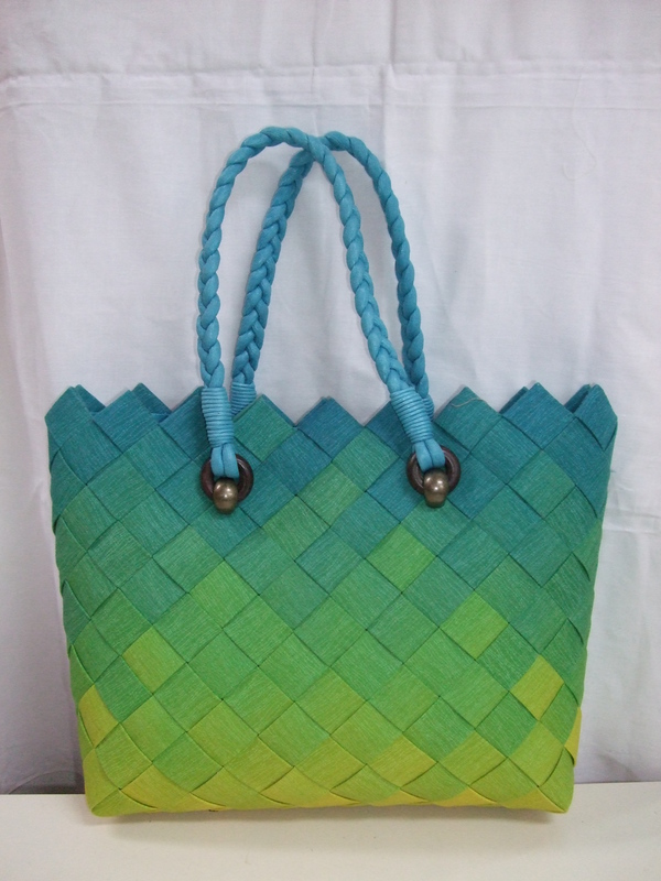 グラデーションプリントの木綿地に25cm幅の接着テープを貼り付けて編んだバックです。裏布はむら染めの木綿地使用、口はマグネットボタンです