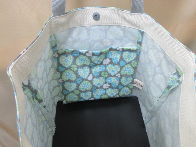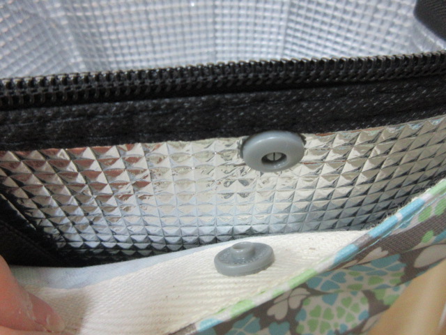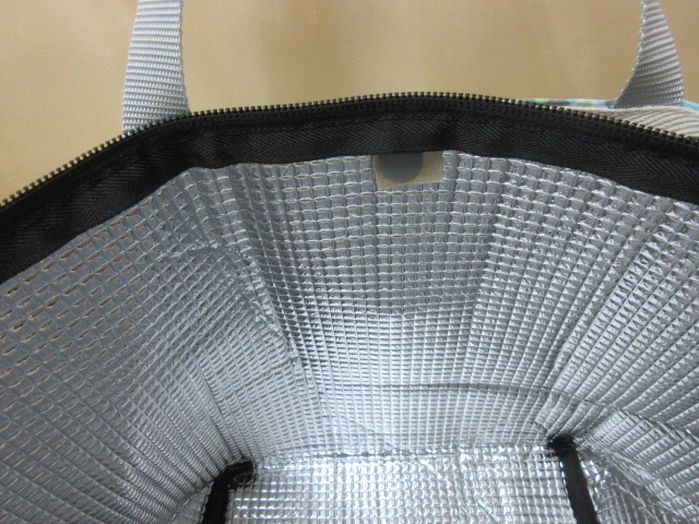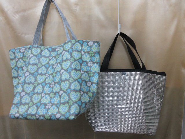 市販の保冷バックに合わせて作ったバックです。重ねて使用するので少し大きめに作ってあります。ずれたりしなようワンタッチボタンで留めてあります。保冷バックはファスナー付き、手作りトートバックはワンタッチボタンになっています。