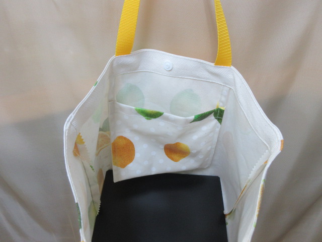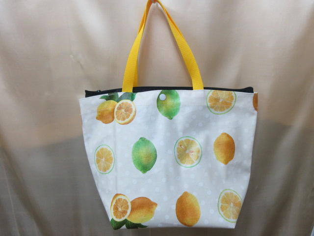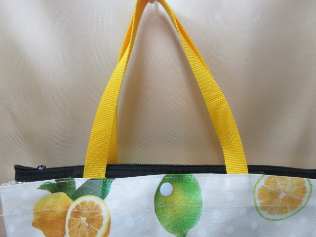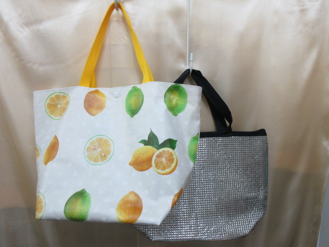市販の保冷バックをを使用して単品でも使えるように、手作りバックと重ねて使うバックです。保冷バックはファスナー付きです。ラミネートのトートバックの口はワンタッチボタンになっています。ワンタッチボタンで保冷バッグと合体させてあります。