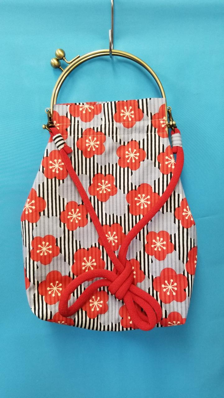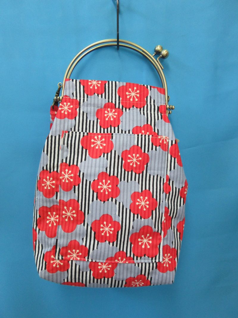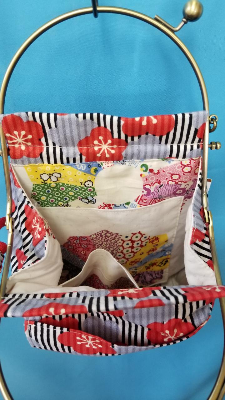 口金を使用して、着物にもあう和柄の生地で仕上げました。持ち手はちりめんの紐を使用外側に携帯電話も入るよう少し深めのポケットを付けました。内側にも同じく深めのポケットを二個付けましたマチもあり、口も広いので出し入れしやすくなっています